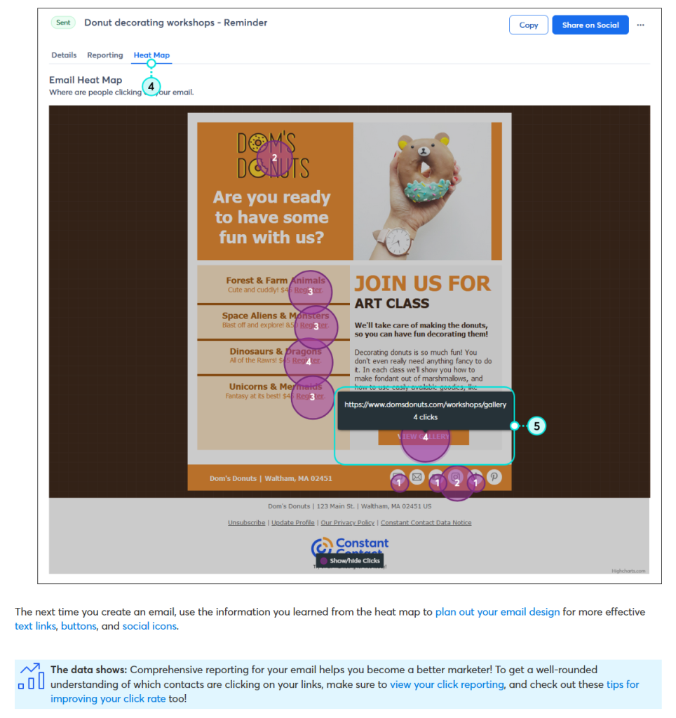 Constant Contact is a long-standing email marketing service, known for its ease of use. It also includes a basic click heatmap report to give users a visual sense of engagement. In Constant Contact’s reporting, you can view an email’s results and toggle to a “Heat Map” tab, which will highlight each link, button, or image that was clicked by your contacts. The interface is rather simple, so it is great for non-technical users who prefer a visual summary.