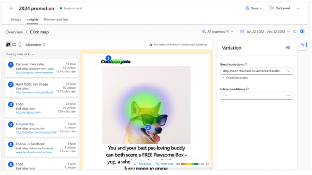 The heatmap in Dynamics 365 shows which areas and links of an email get the most engagement, using color overlays and percentages similar to other tools. However, it goes further by allowing filtering and segmentation of the heatmap data. For example, marketers can filter results by email variation (useful if you send slightly different content to segments) or by journey/version, and even by date range. The tool also lets you toggle between desktop vs. mobile to see how clicks differ by device type.