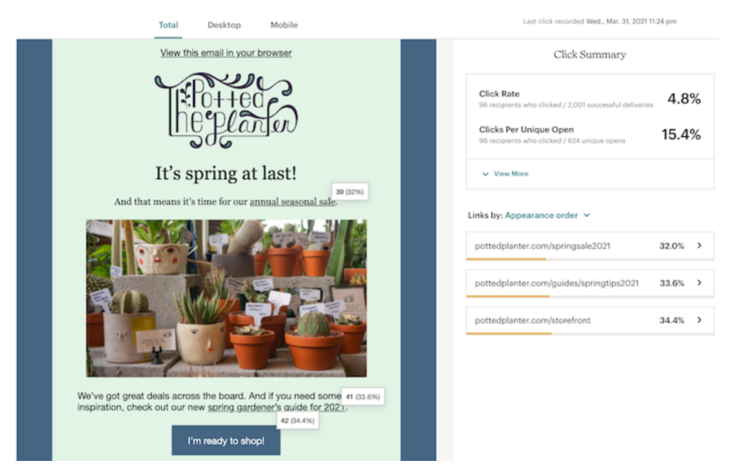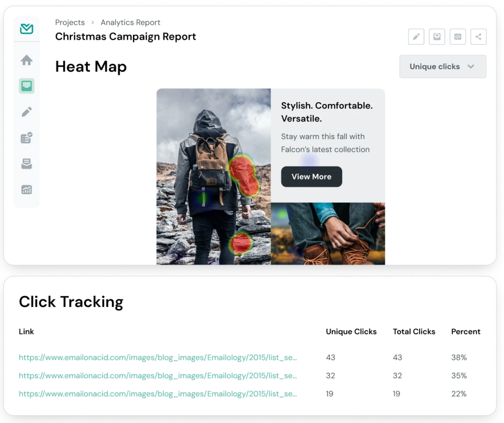 Mailchimp is one of the most popular email marketing tracking software options, widely used by both beginners and small businesses. Among its many features is the Click Map, a built-in heatmap that places click data directly over your email design so you can see which buttons or links attracted the most attention.