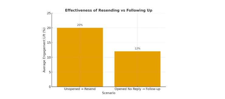 As you know, contemporary email platforms provide great insights into whether your email was opened, clicked, or, alas, ignored. Rely on stats like open rates, click-through metrics, and delivery confirmations. These things can actually shape your strategy. Think about it: a message never opened may justify a resend, while an opened but unanswered email signals the need for a follow-up. That’s the difference! According to Walla online marketing agency, resending a campaign to non-openers can boost open rates by up to 30%, click-through rates by 14%, conversion rates by 26%, and ROI by 29%. On the other hand, cold outreach follow-ups can lift responses by 20–27%, as stated by the Manyreach cold emailing platform.