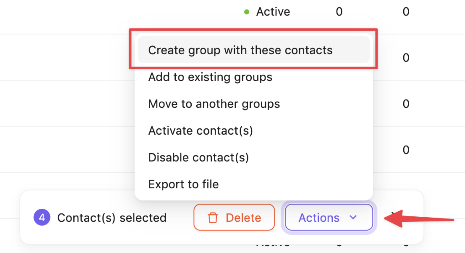 - To remove contacts from the group select these contacts and click Actions button at the bottom of the screen. There you’ll see the option to delete the contacts from the group.