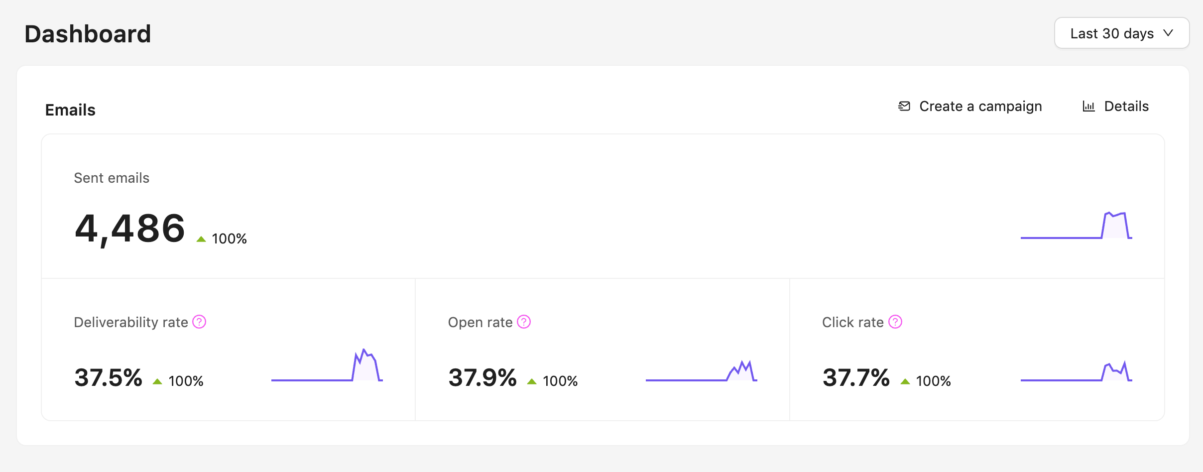 - Open rate (%) – the percentage of recipients who opened your emails. This shows how effective your subject lines and sender reputation are.