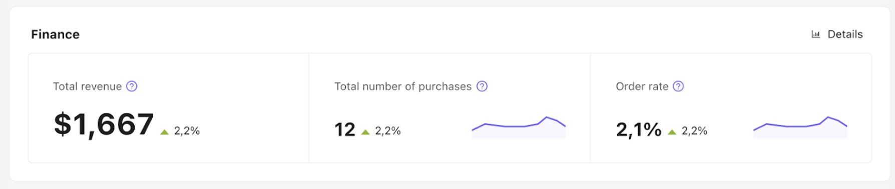 - Total number of purchases – the total number of completed orders during the selected period. Each successful checkout counts as one purchase.