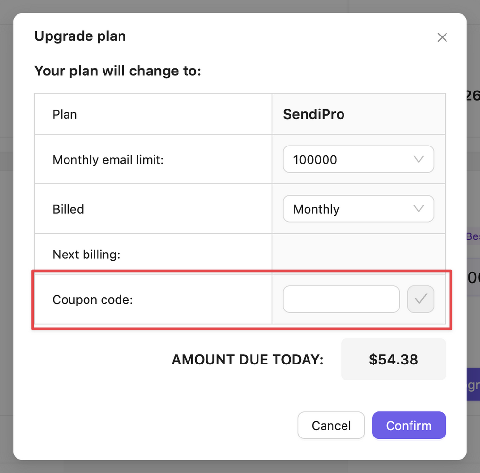 - Confirm — the discount will apply to your next invoice or purchase of email credits.