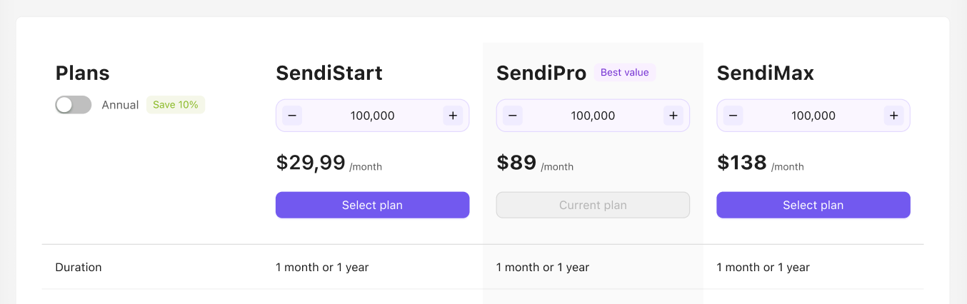 In Sendigram, you're not locked into a single plan. You can switch to a different email package at any time — for example, if your sending needs increase, or if you want to scale back.