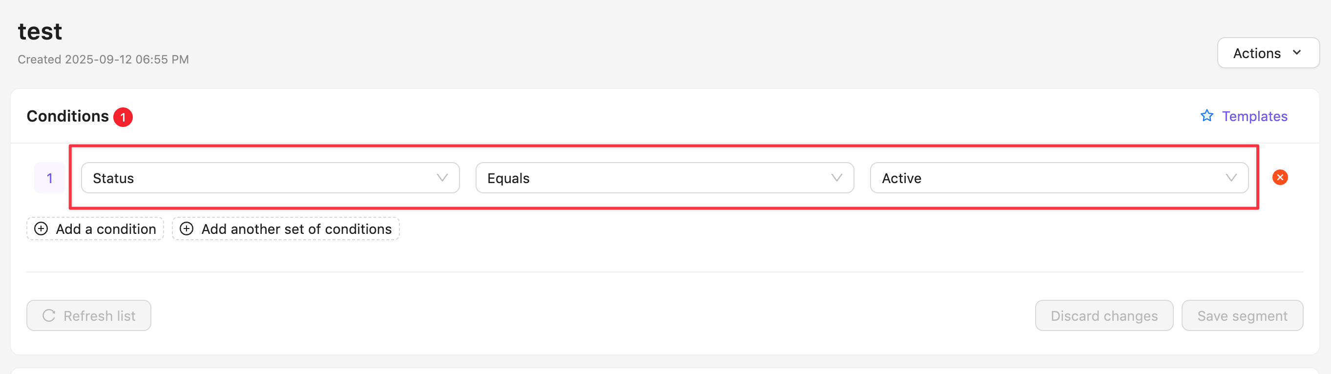 - Above the list of the segment's contacts you will see the Conditions bar. There you can add,