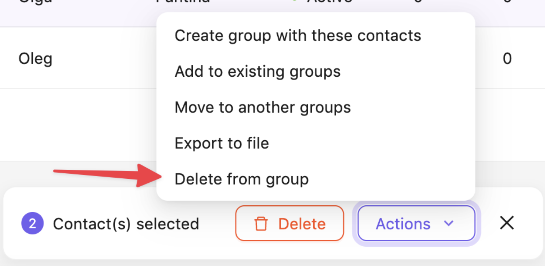 - To remove contacts from the group select these contacts and click Actions button at the bottom of the screen. There you’ll see the option to delete the contacts from the group.