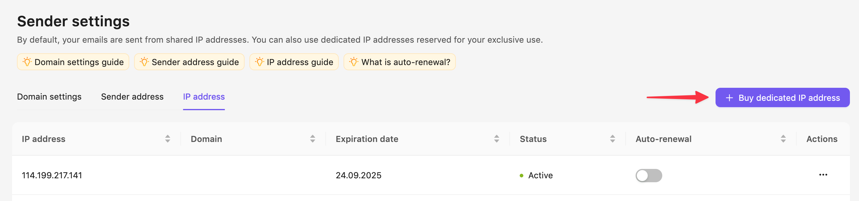 If you use a dedicated IP in Sendigram, it's important to keep it active to maintain your sender reputation. To prevent interruptions, you can enable auto-renewal so your IP is automatically renewed before it expires.