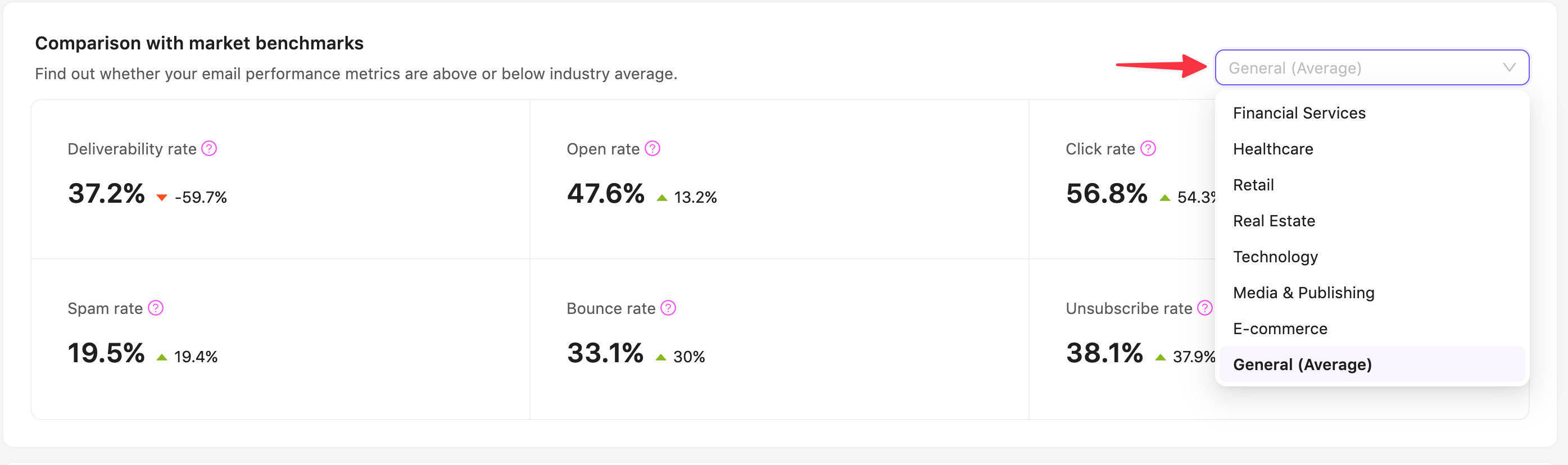 Comparing the metrics of your campaign with industry standards is a great way to see if your email marketing activities are on the right track. Sendigram offers you a variety of industries to choose from: