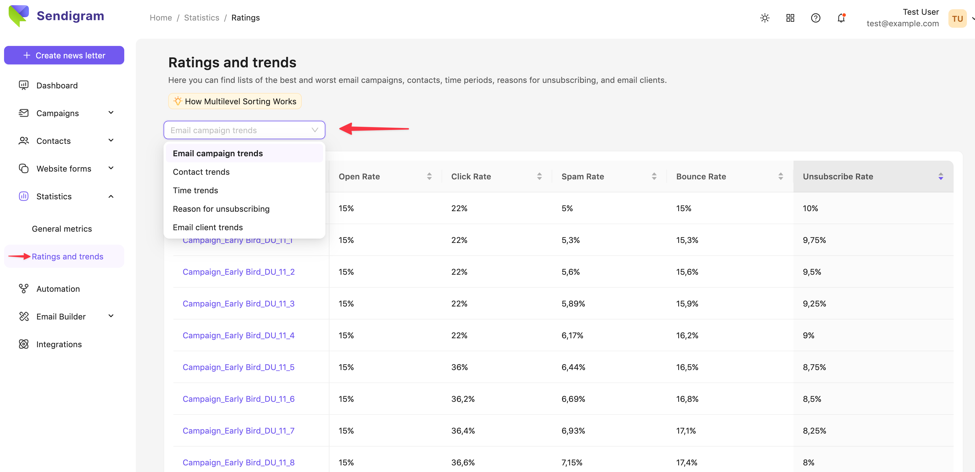 Sendigram gathers and analyzes your statistical data to create a wide variety of rating lists. They make it easier to compare your campaigns performance, see the most popular reasons for unsubscribing, and so on.