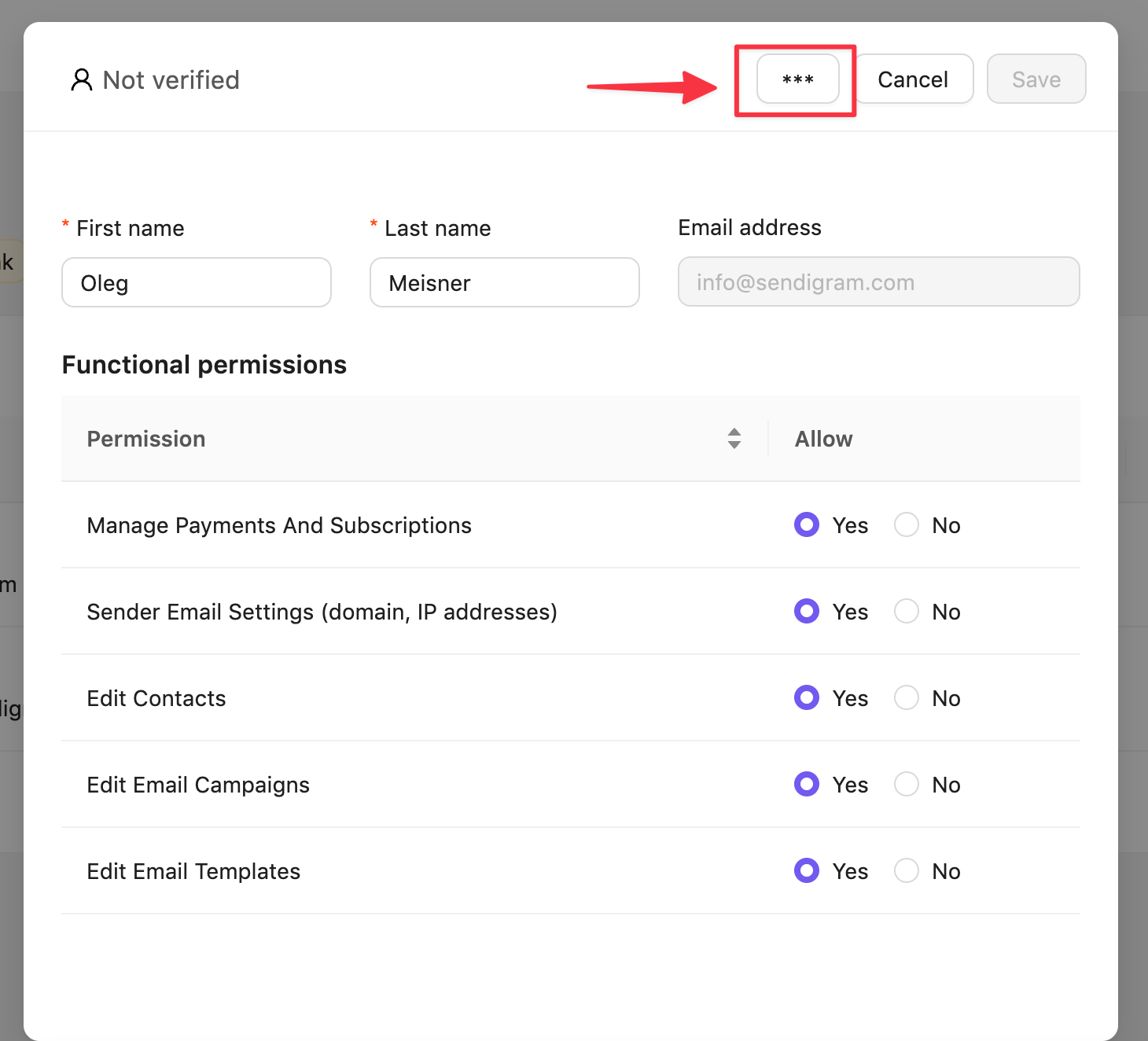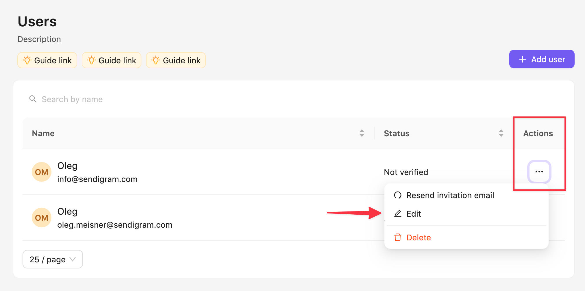 In Sendigram, Admins have full access to billing, domains, and user management. Sometimes, it's necessary to transfer Admin rights — for example, if the account owner changes, a team member is promoted, or you want to hand over account management responsibilities.
